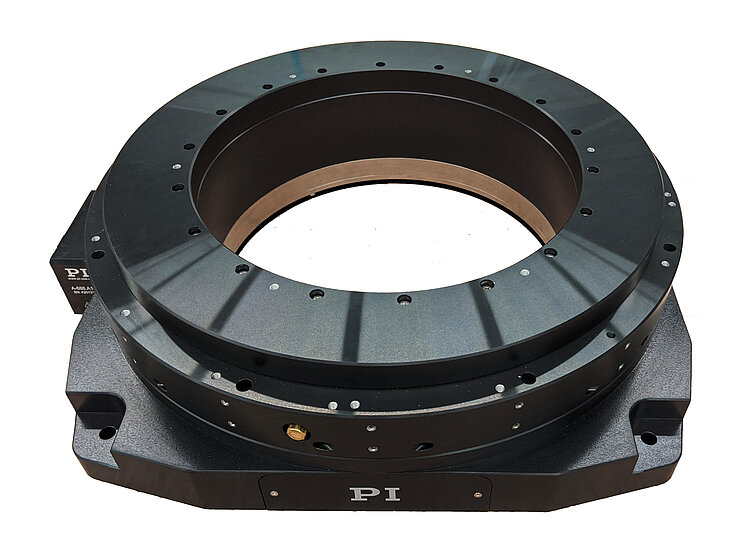 PIglide RLA rotation stage with air bearing; ironless 3-phase torque motor; 360° rotational angle; 150 N load capacity; 500 min⁻¹ maximum angular velocity; incremental angle measuring system, 0.03 µrad sensor resolution, rotary, sin/cos, 1 V peak-peak
