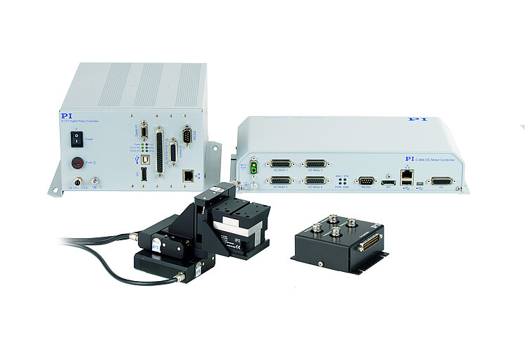 The fiber alignment system is supplied as a complete package with the required C-884.4DC and E-727.AS controllers as well as with extensive software including the PIMikroMove graphic user software for startup and operation of all PI systems.