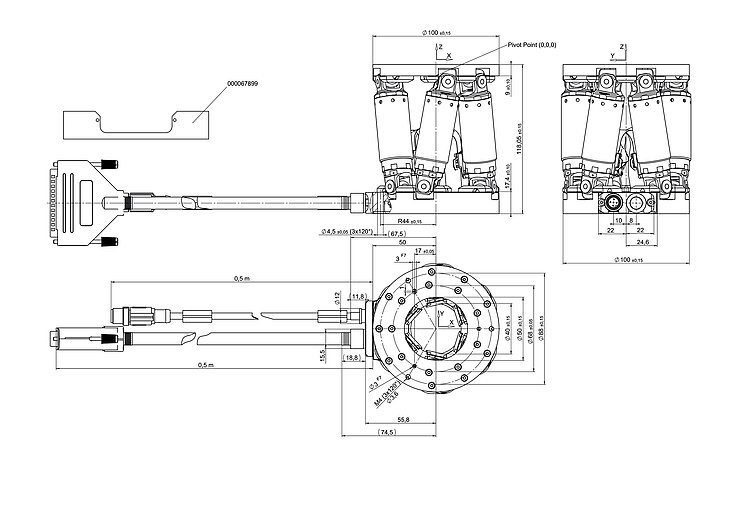 Miniature hexapod for 6 degrees of motion freedom; BLDC motors; 3 kg payload; 6 mm/s velocity; 0.5 m cable length. Connecting cables are not included in the scope of delivery and must be ordered separately.
