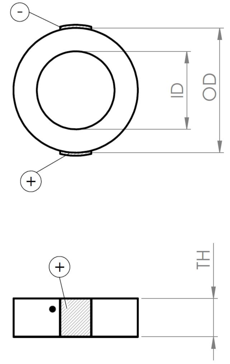 Round PICMA® Chip miniature piezo actuator with inner hole, 2.0 µm travel range, OD 12 mm × ID 6 mm × TH 2.5 mm, connecting wires