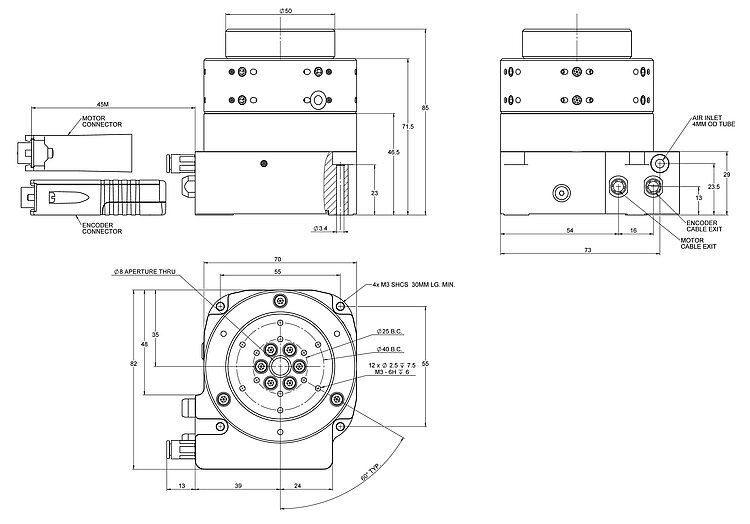 PIglide RM rotation stage, air bearing, 50 mm motion platform diameter, 25 mm journal length, incremental angle measuring system with sin/cos signal transmission, 8192 lines/revolution, slotless, brushless 3-phase torque motor