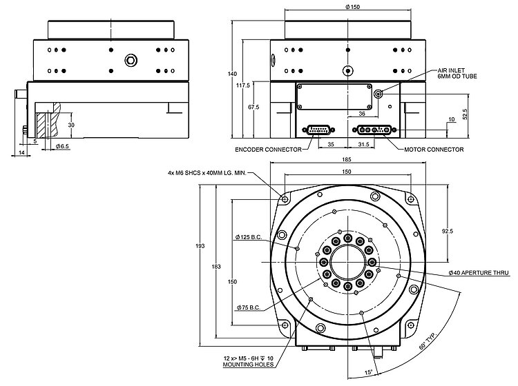 PIglide RM rotation stage, air bearing, 150 mm motion platform diameter, 50 mm journal length, incremental angle measuring system with sin/cos signal transmission, 23600 lines/revolution, slotless, brushless 3-phase torque motor