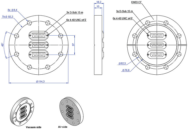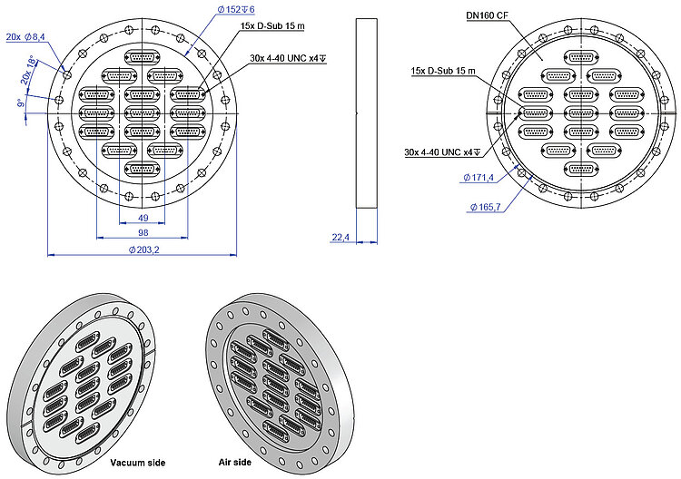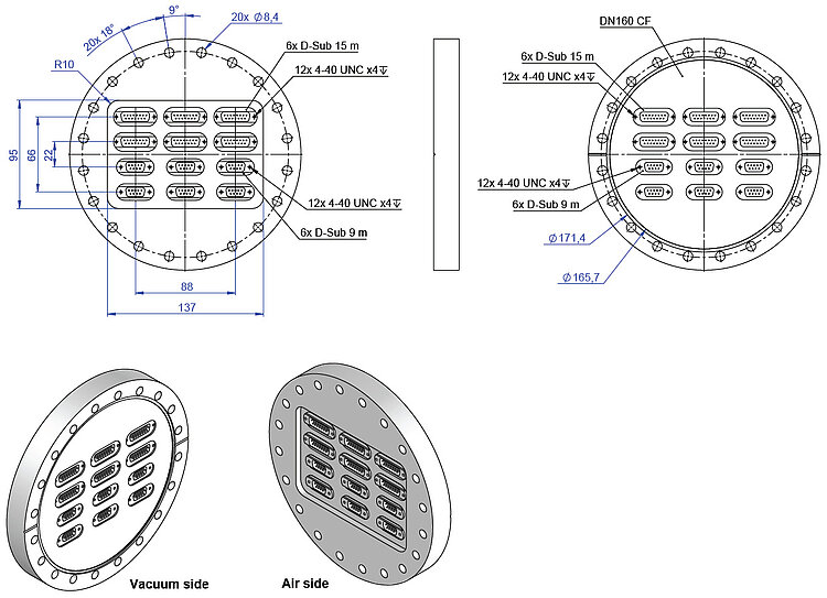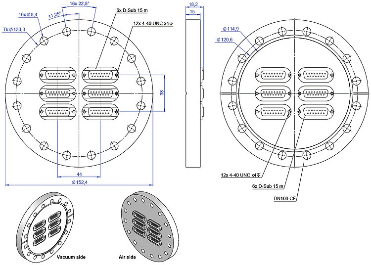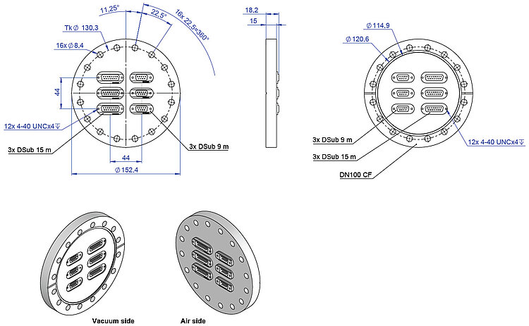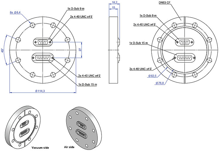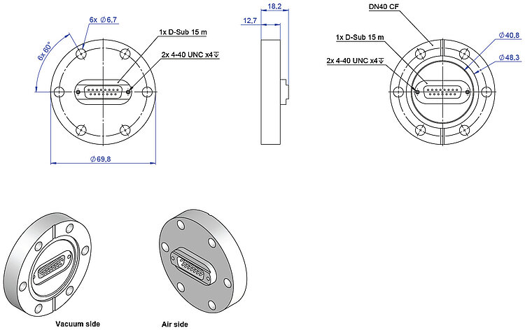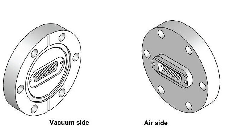 Vacuum feedthroughs are the interface between the positioner within the vacuum enclosure and the controller on the air side. With their help, vacuum applications can be connected to standard controllers. Vacuum feedthroughs are available for a variety of connectors and for a different number of cables. The cables are not part of the scope of delivery for the feedthroughs.