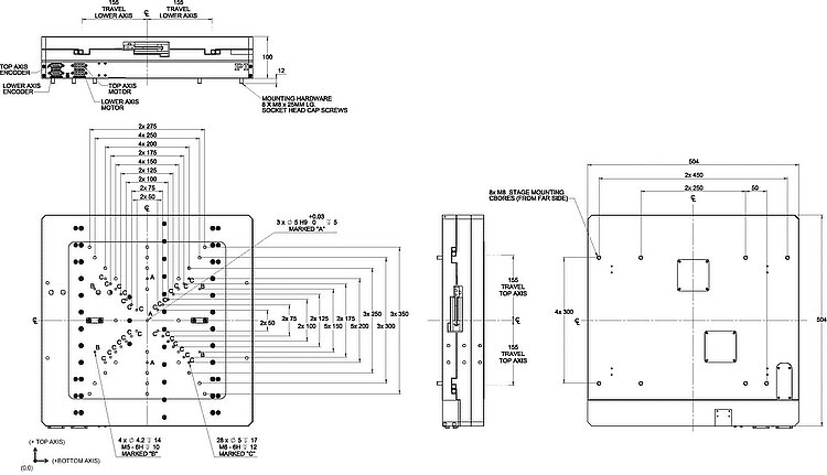 Ultra-precision direct drive XY stage; ironless 3-phase linear motor; 310 mm × 310 mm travel range (X × Y); 500 N load capacity; 1000 mm/s × 1000 mm/s maximum velocity; absolute linear encoder, 1 nm sensor resolution, BiSS-C, 32 bit